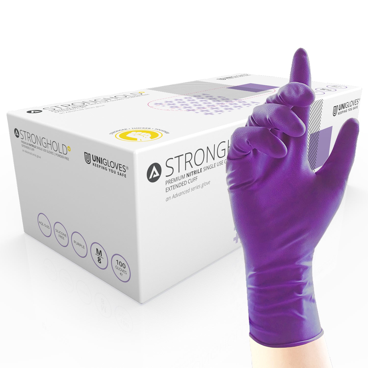 Extended cuff, AQL 0.65, enhanced chemical splash protection, silicone free, purple, medical grade, heavy weight nitrile examination gloves made with a unique Unigloves formulation for a softer, more comfortable finish