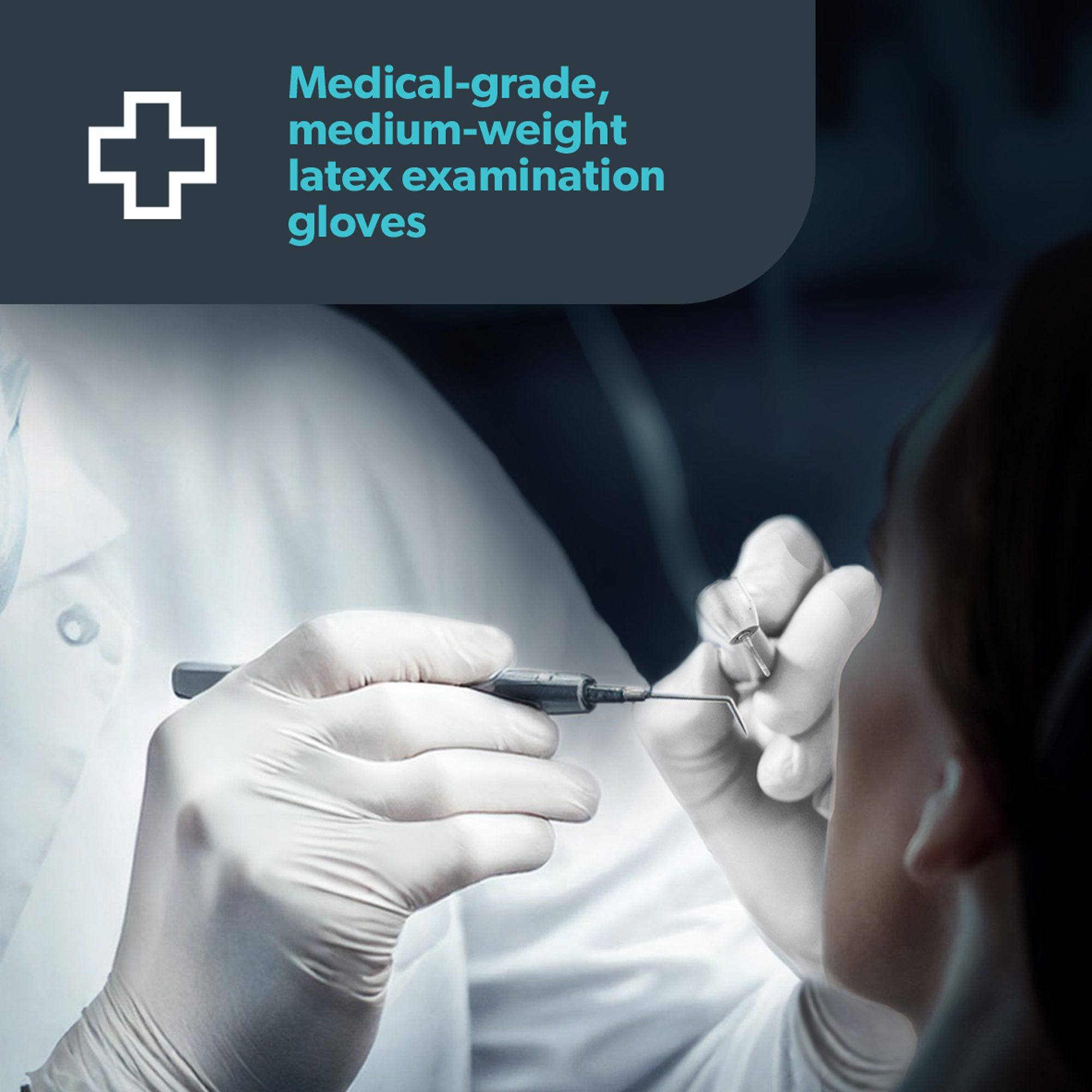 Chemical tested, natural, medical grade, medium weight latex examination gloves, washed offline for a softer, more comfortable finish