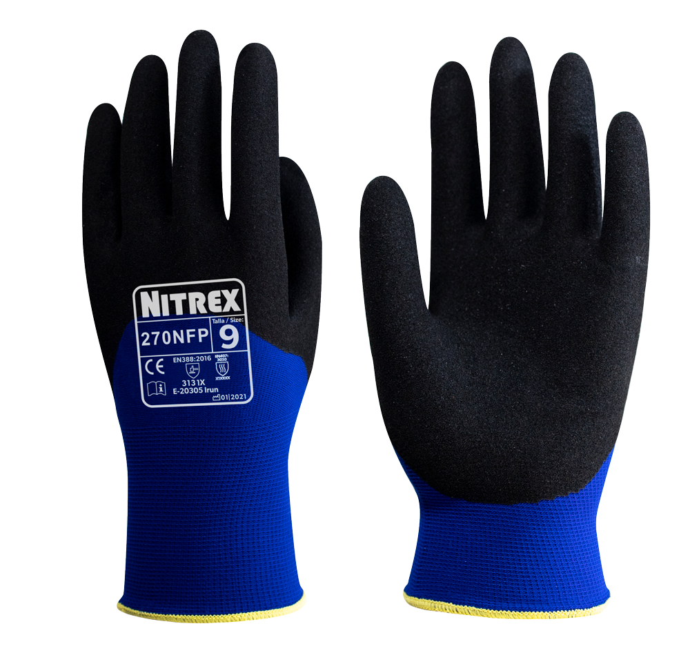 Nitrex 270NFP Unsere Nitrex 270NFP Nitrilhandschuhe mit festem Griff sind eine ausgezeichnete Sicherheitshandschuh-Lösung für eine breite Palette von Anwendungen am Arbeitsplatz. Diese sind jedoch keine gewöhnlichen Arbeitshandschuhe. Ausgestattet mit unserer fortschrittlichen NitreGrip® Technologie ist der Nitrex 270NFP ein hervorragender Handschuh für Arbeiten, bei denen ein sicherer Griff von größter Bedeutung ist. Zusätzlich ist der Nitrex 270NFP OEKO-TEX® STANDARD 100 zertifiziert, um sicherzustellen, dass unsere Handschuhe frei von Schadstoffen sind und die Gesundheit Ihrer Mitarbeiter schützen. Die NitreGrip® Technologie kommt in der Nitrex-Reihe von Handschuhen zum Einsatz, die über eine neue, fortschrittliche Oberflächenbehandlung verfügen, die einen sicheren Griff bei Arbeiten in nassen und öligen Umgebungen bietet und ihre Qualität auch bei trockenen Verhältnissen beibehält. Das sandige Nitril sorgt für eine sichere Griffigkeit, vergleichbar mit einem Saugnapf, der sich fest an das zu bearbeitende Material anlegt. Die Oberflächenbehandlung verringert den Kraftaufwand beim Greifen und sorgt dafür, dass der Handschuh weich und damit bequem bleibt, was die Ermüdung der Hände verringert. Natürlich bieten diese allgemeinen Handhabungshandschuhe ihren Trägern viel mehr als nur einen fortschrittlichen festen Griff. Die Nitrilbeschichtung dieser nahtlosen, mit 15 Gauge Nylon gefütterten Handschuhe bietet einen ausgezeichneten Abrieb- und Rissschutz, um Hände und Handgelenke vor Kratzern und Schrammen durch abrasive Materialien zu schützen, während das nahtlose, leichte Innenfutter äußerst komfortabel ist. Die Nitrex 270NFP-Handschuhe für allgemeine Arbeiten sind auch resistent gegen Öle und Fette und bieten einen hervorragenden Schutz, während sie den ganzen Tag über bequem zu tragen sind.