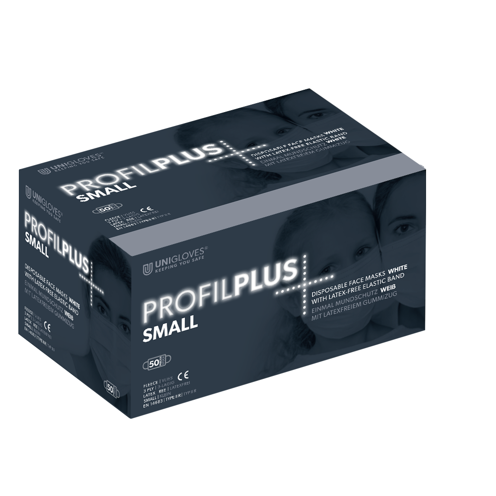 Die Unigloves Profil Plus Small Gesichtsmaske verfügt wie ihr größerer Verwandter Profil Plus über die gleichen Eigenschaften und kann daher in der Medizin, Industrie oder privat eingesetzt werden. Die Gesichtsmaske wurde nach EN 14683 (Typ II R) geprüft und verfügt dank des 3-fach glasfaserfreien Filtermediums über eine Bakterienfilterleistung von bis zu 98 %. Der Schutz des Anwenders sowie der Umwelt kann somit gewährleistet werden. Durch die reduzierte Maskengröße ist diese Maske für kleine Gesichter geeignet (auch als Kinder-Gesichtsmaske geeignet). Durch den flexiblen Nasenbügel (nickelfrei) lässt sich die Maske optimal an die Nase anpassen. Hautfreundliche Gummibänder (latexfrei) sorgen für einen guten Sitz am Kopf.