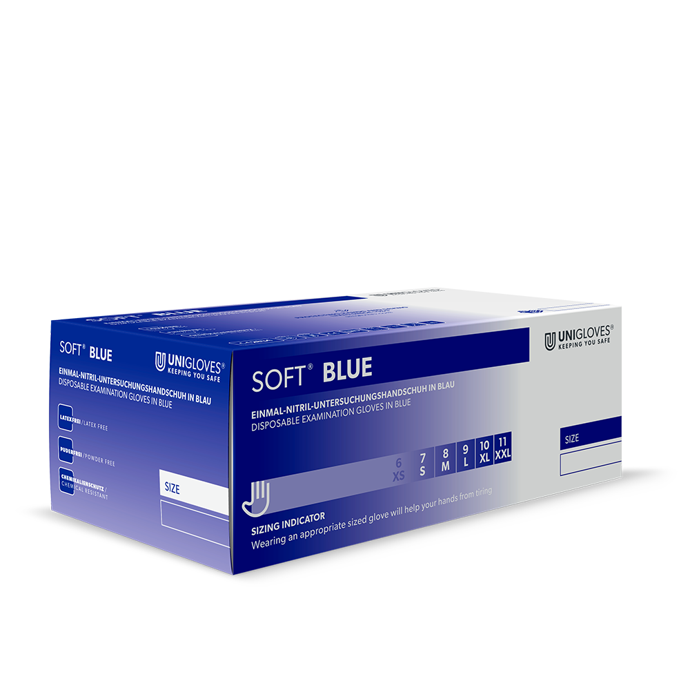Der SOFT® BLUE ist ein lebensmittelechter Hygiene- und Schutzhandschuh, der sowohl in der Gastronomie und Lebensmittelindustrie als auch in verschiedenen medizinischen Bereichen verwendet wird. Der aus Nitril gefertigte Einweghandschuh wurde nach der PSA-Verordnung (EU) 2016/425 sowie den europäischen Normen EN 374, EN 420 und EN 455 getestet. Das wasserdichte Material ist widerstandfähig und bietet Schutz gegen Viren, Pilze und Bakterien. Der Handschuh ist latex-, thiuram- und proteinfrei und somit äußerst hautfreundlich. Die mikrogerauten Fingerspitzen gewährleisten Sicherheit und Rutschfestigkeit, ohne das Tastempfinden einzuschränken. Dank des stabilen Rollrand lässt sich der puderfreie Handschuh problemlos an- und ausziehen. Das beidhändige Design und die flexible Passform machen den Soft Nitril Blue 200 zur passenden Wahl für einen schnellen, wechselnden Gebrauch.