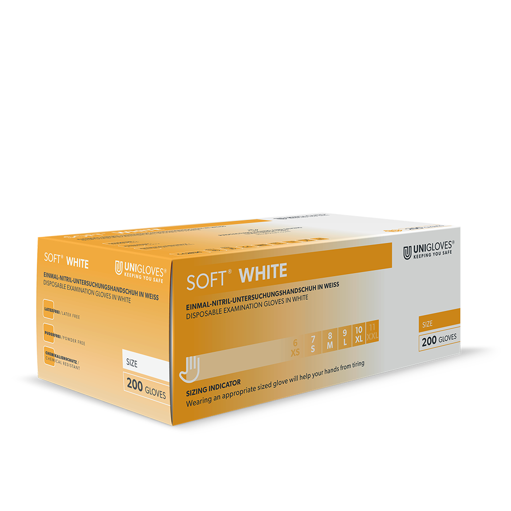 Der SOFT® WHITE ist ein lebensmittelechter Hygiene- und Schutzhandschuh, der sowohl in der Gastronomie und Lebensmittelindustrie als auch in verschiedenen medizinischen Bereichen verwendet wird. Der aus Nitril gefertigte Einweghandschuh wurde nach der PSA-Verordnung (EU) 2016/425 und den europäischen Normen EN 374, EN 420 und EN 455 getestet. Das wasserdichte Material ist widerstandfähig und bietet Schutz gegen Viren, Pilze und Bakterien. Der Handschuh ist latex-, thiuram- und proteinfrei und somit äußerst hautfreundlich. Die mikrogerauten Fingerspitzen gewährleisten Sicherheit und Rutschfestigkeit, ohne das Tastempfinden einzuschränken. Dank der dem stabilen Rollrand lässt sich der puderfreie Handschuh problemlos an- und ausziehen. Das beidhändige Design und die flexible Passform machen den Soft Nitril White 200 zur passenden Wahl für einen schnellen, wechselnden Gebrauch.
