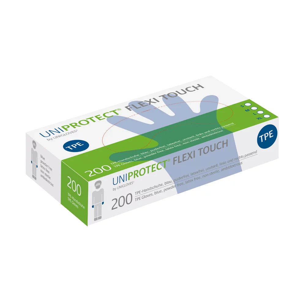 Der Uniprotect Flexi Touch ist ein lebensmittelechter, aus TPE gefertigter Hygienehandschuh, der vornehmlich in industriellen Bereichen eigesetzt wird. Das wasserdichte Thermoplastic Elastomer ist überaus weich sowie frei von Proteinen und Dithiocarbamaten. Der Uniprotect Flexi Touch eignet sich somit bestens für empfindliche Haut. Die glatte Oberfläche sorgt für ein natürliches Tastempfinden. Dank der Passform sowie der Flexibilät lässt sich der Handschuh ohne Probleme schnell an- und ausziehen. Durch das beidhändige Design wird ein häufig wechselnder und dennoch günstiger Gebrauch ermöglicht.